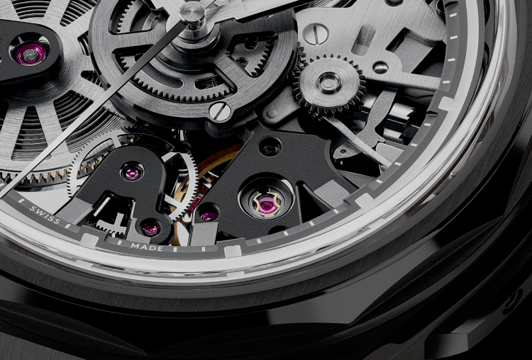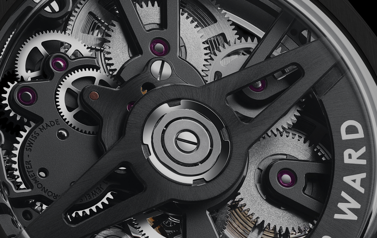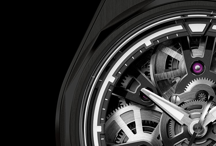 Look through the sapphire dial and case back, and you’ll see how the finishing – created on the Elara NS CNC milling machine – makes this architecture of CW-001 a feast for the eyes. You can even see the twin barrels, and winding mechanism at 3 o’clock.
