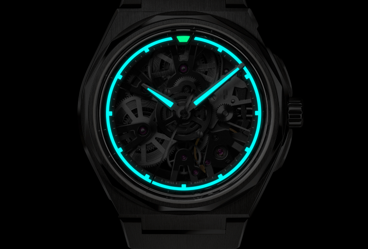 Lume-filled rhodium minute ring and handset deliver luminosity after dark.