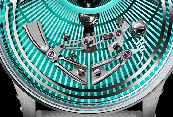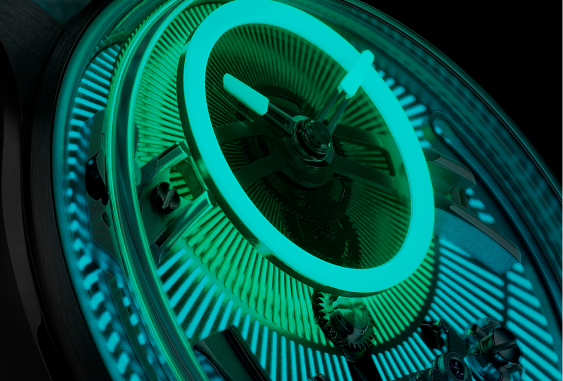 As with the original Bel Canto, the smoked sapphire dial floats above the platine, but here the circumference and handset are filled with Globolight® to deliver an intense neon-green glow for timekeeping after dark.