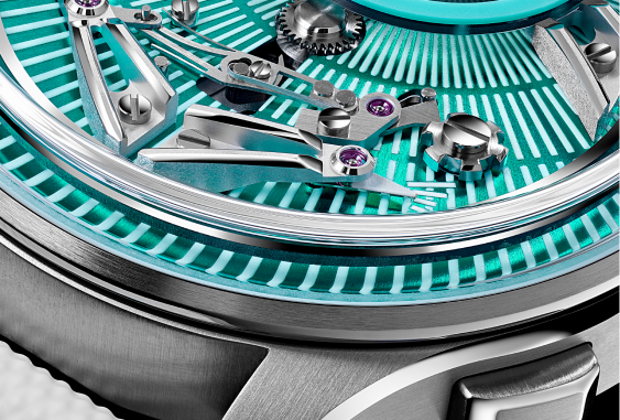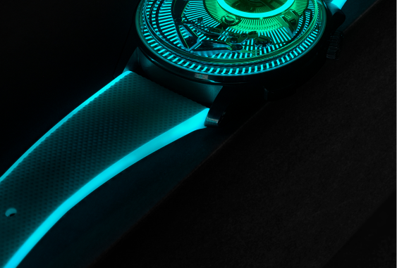 At its base lies an all-new platine, printed with multiple layers of Super-LumiNova® arranged in a shimmering sunray pattern. The lower two sectors glow blue, while the upper area is a vivid green, which all return to blue in daylight. Even the on/off indicator joins in, switching from white to a luminous emerald when the lights go out.