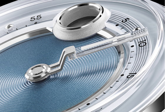 The C1 Jump Hour Mk V has a dramatically complex four tier dial construction. At the centre sits a three-dimensional inner piece stamped with 27 concentric circles. A polished, applied circular-brushed metal ring rises above, and beyond this, a sapphire ring printed with minute markers. A sapphire minute hand with a unique stepped-design - a first for Christopher Ward. Completed by a multi-Super-LumiNova® layered undercoat, for an ethereal, cool blue glow in low light.