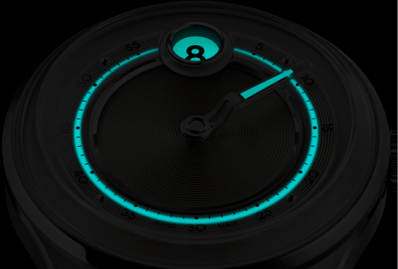 Dial ring and minute hand are undercoated with multiple layers of Super-LumiNova®