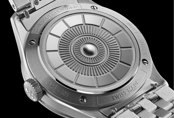 Detailed caseback denoting the 12-hour stops of the jump hour wheel and the minutes between