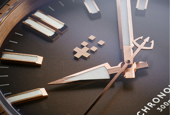 As with previous CW ‘ombré’ watches, the lacquered deep-brown dial gradually changes from light to dark toward the edge – without sacrificing legibility. The lume-filled handset delivers clarity and precision, while the ‘5N gold’ indexes – also filled with Super-LumiNova® – boast diamond-polished facets that catch the light. The date wheel at 6 o’clock is colour-matched to the dial, while the applied twin-flags logo – also in 5N gold – adds balance and depth.